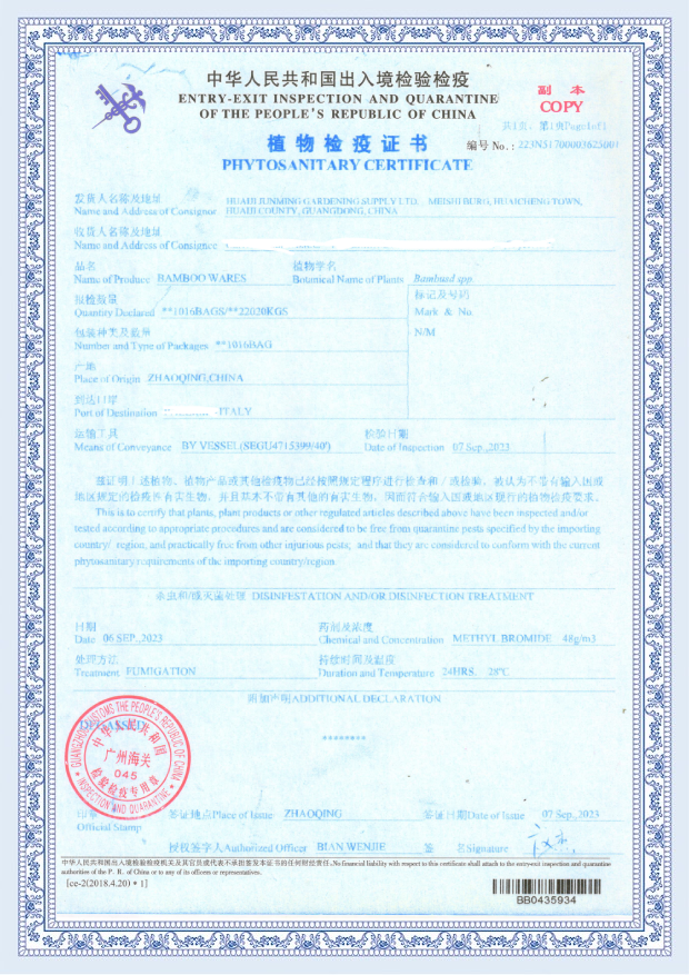 Certification: Fumigation certificate/ Phytosanitary certificate -